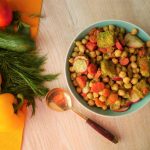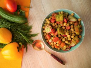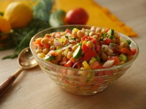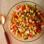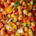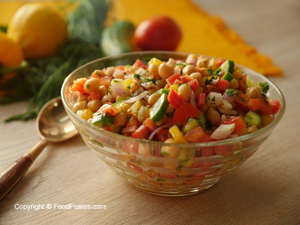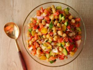 In bowl,add chickpeas,carrot,cucumber,onion,tomato,yellow bell pepper,fresh coriander,mint leaves and drizzle lemon & garlic dressing,mix well & serve.