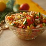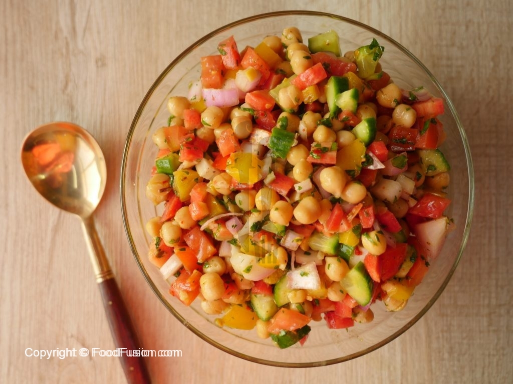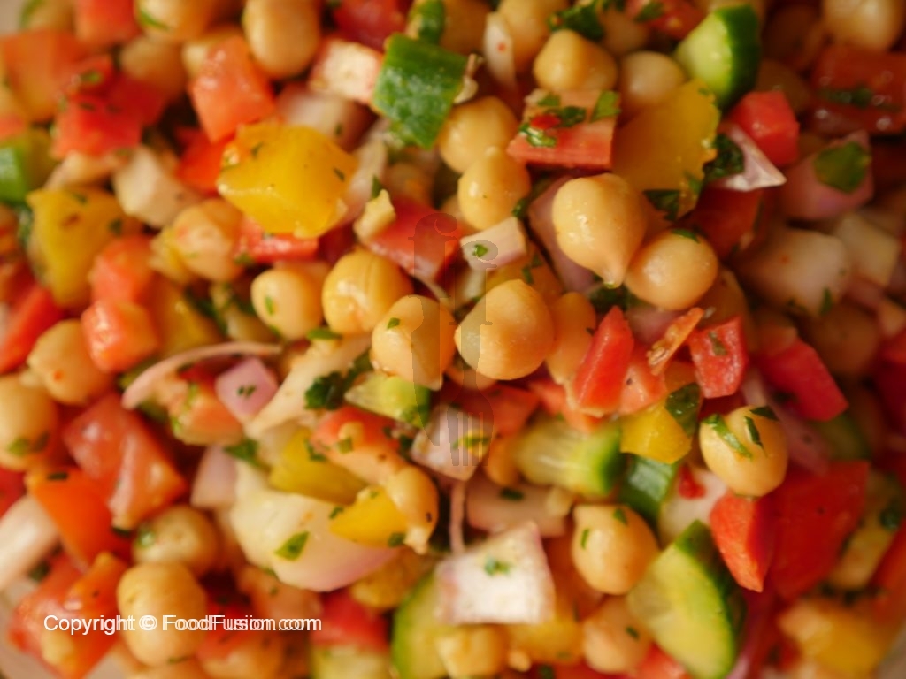 Bowl mein chanay,gajar,kheera,pyaz,tamatar,yellow bell pepper,hara dhania,podina aur lemon & garlic dressing dal ker ache tarhan mix ker lein & serve karein.