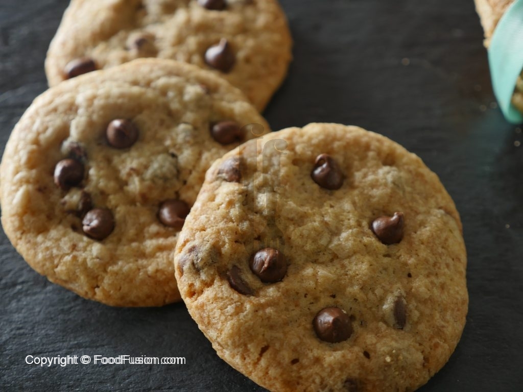 Grease baking tray with oil,take a mixture and make a ball,place it over the baking tray and slightly press it and add chocolate chips.