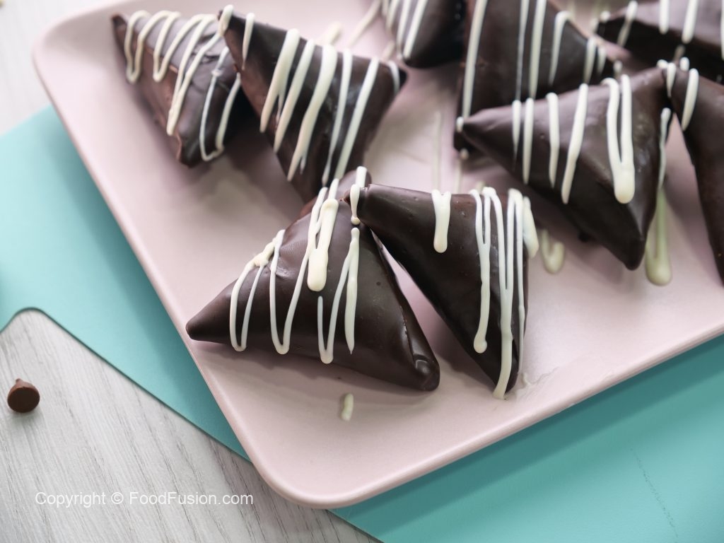 -Tayyar chocolate & nuts filling dal dein aur roll ker ka samosa ki shape bana lein & edges ko flour slurry laga ker seal ker lein.