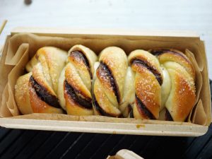 -Spread chocolate spread on rolled dough & flip one end over the other.