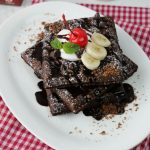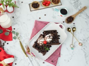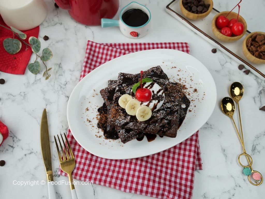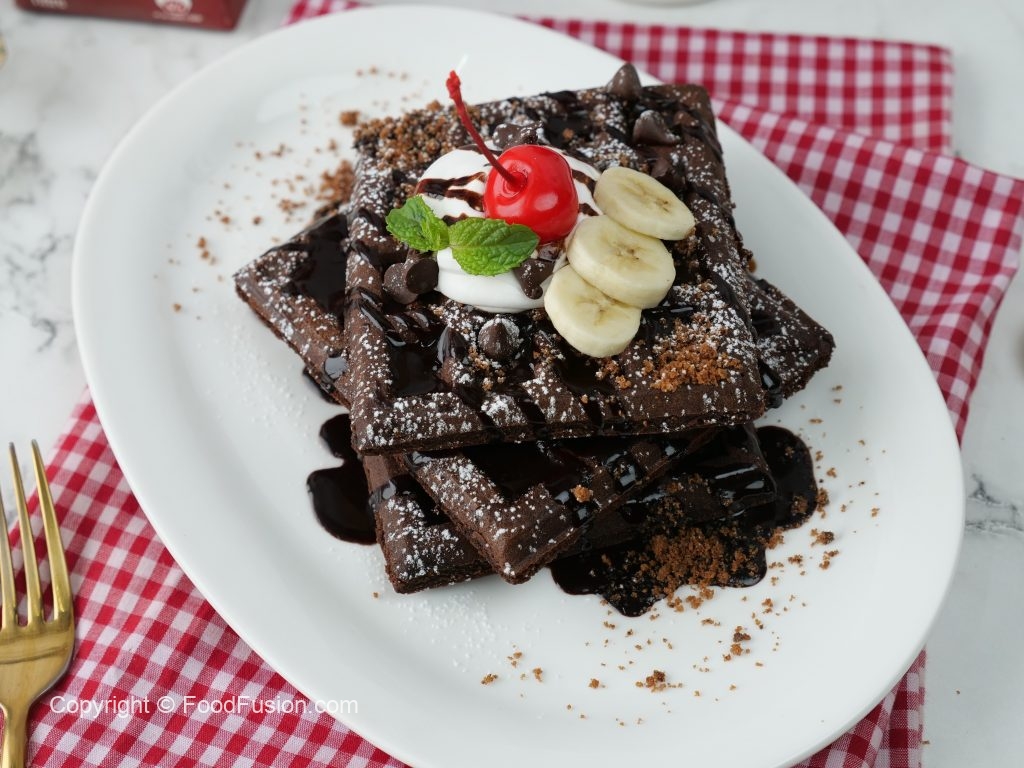 -On chocolate waffles,pour prepared chocolate sauce,cookie crumbs,olper’s whipped cream,chocolate chips, icing sugar & garnish with banana slices,cherry & mint leaves.