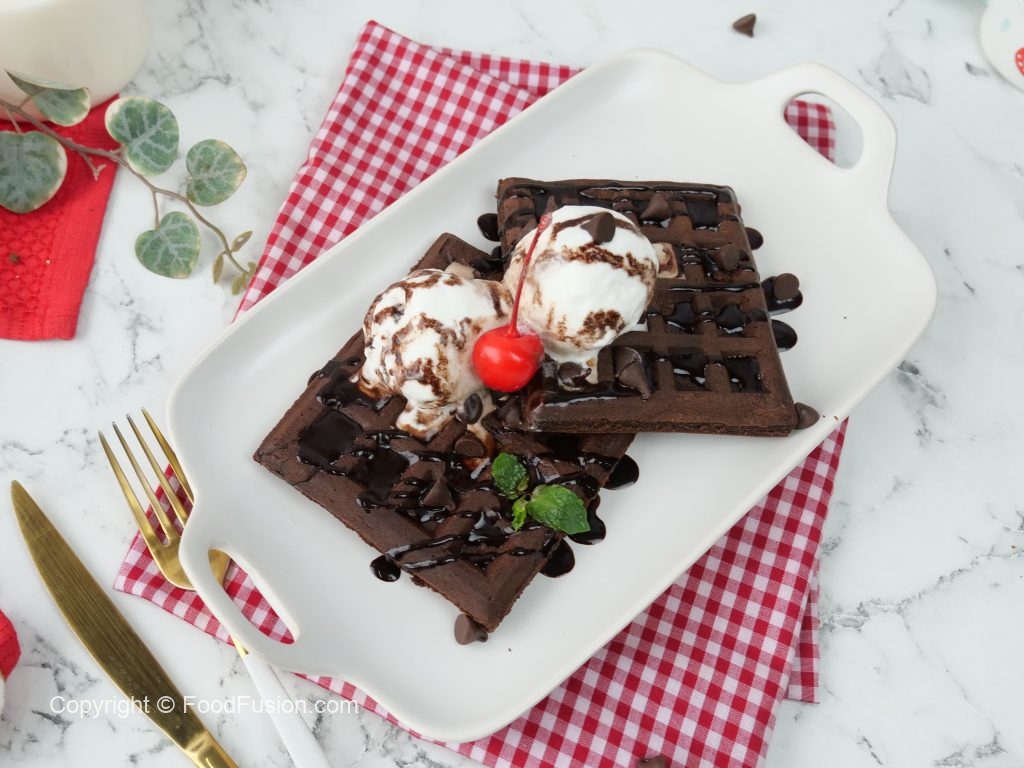 -Chocolate waffles per vanilla ice cream,tayyar chocolate sauce & chocolate chips dal dein,cherry & mint leaves sa garnish ker ka serve karein.