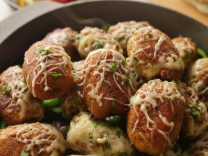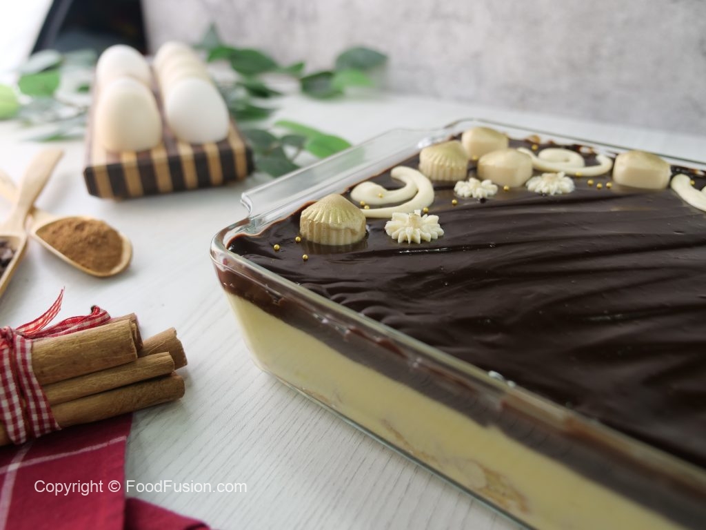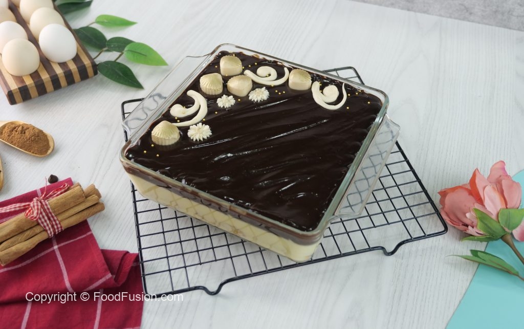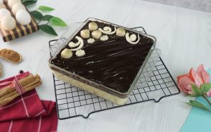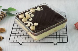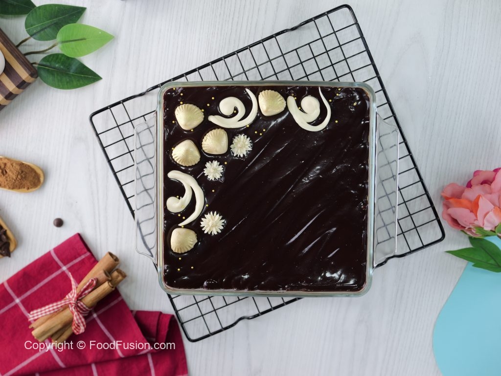 -Now pour & spread prepared chocolate ganache on churros pudding.