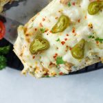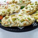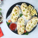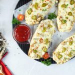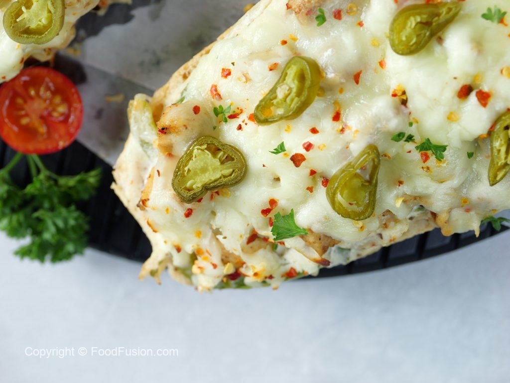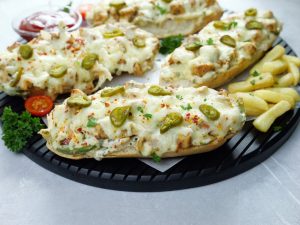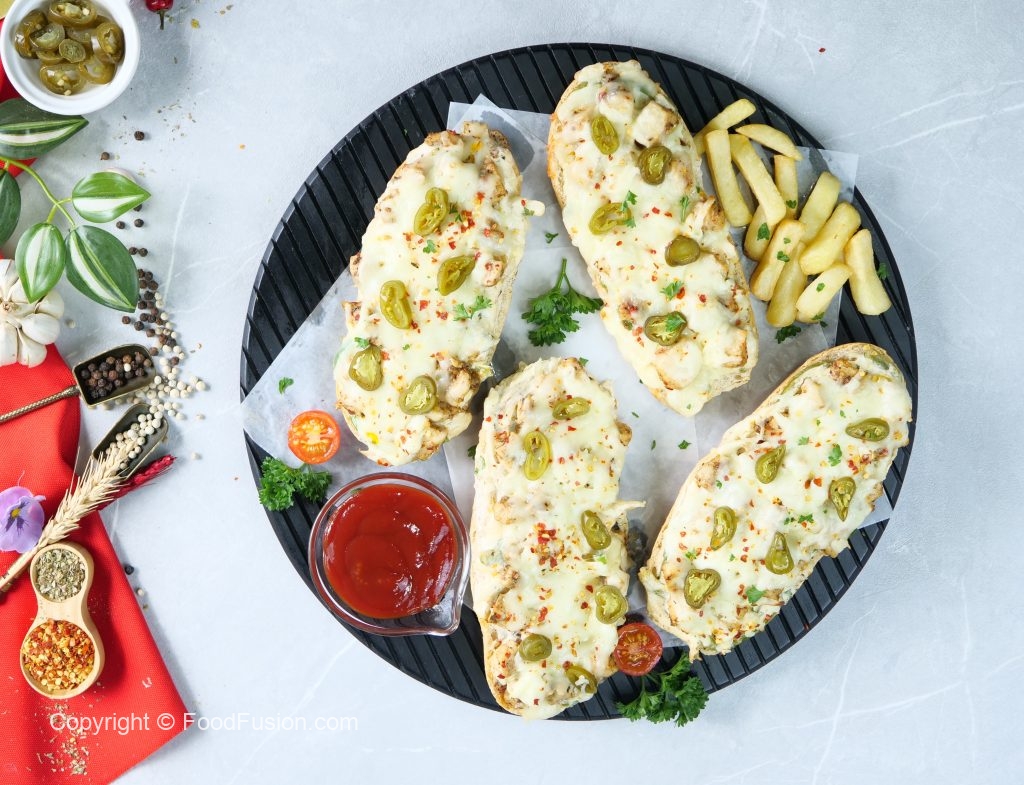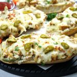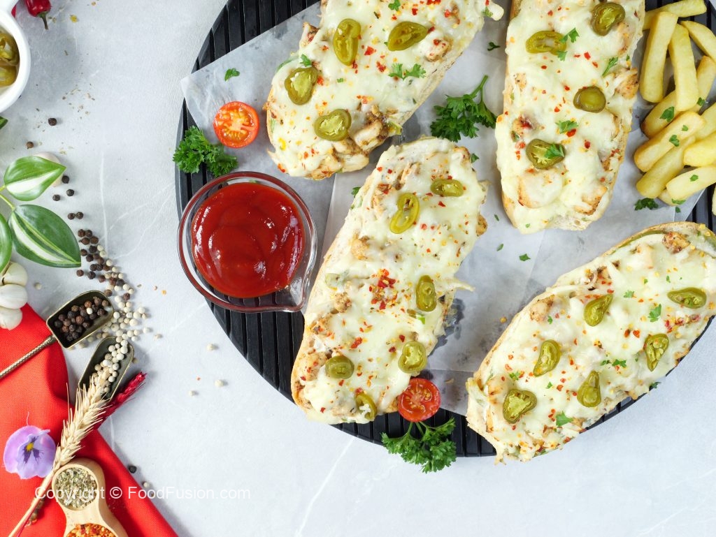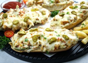 -On each side of dinner roll/buns,add & spread creamy veggies,prepared chicken,cheddar cheese, mozzarella cheese,red chilli crushed & pickled jalapenos.