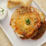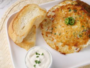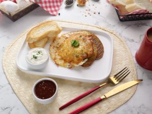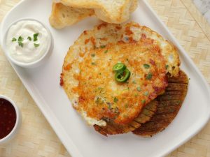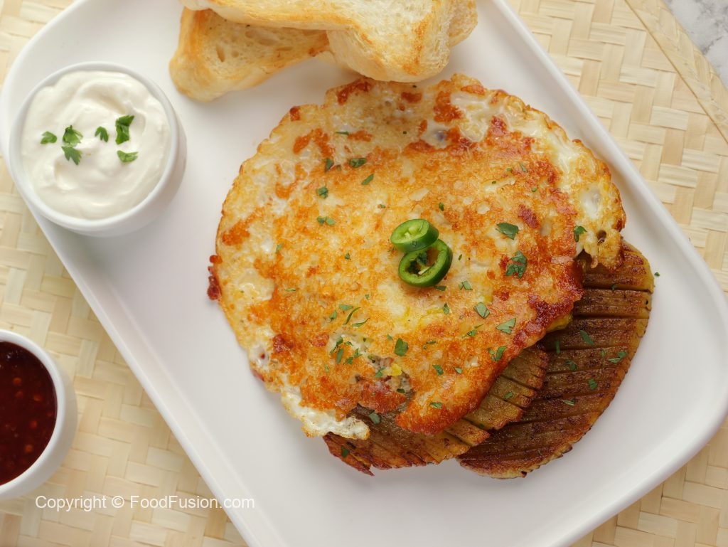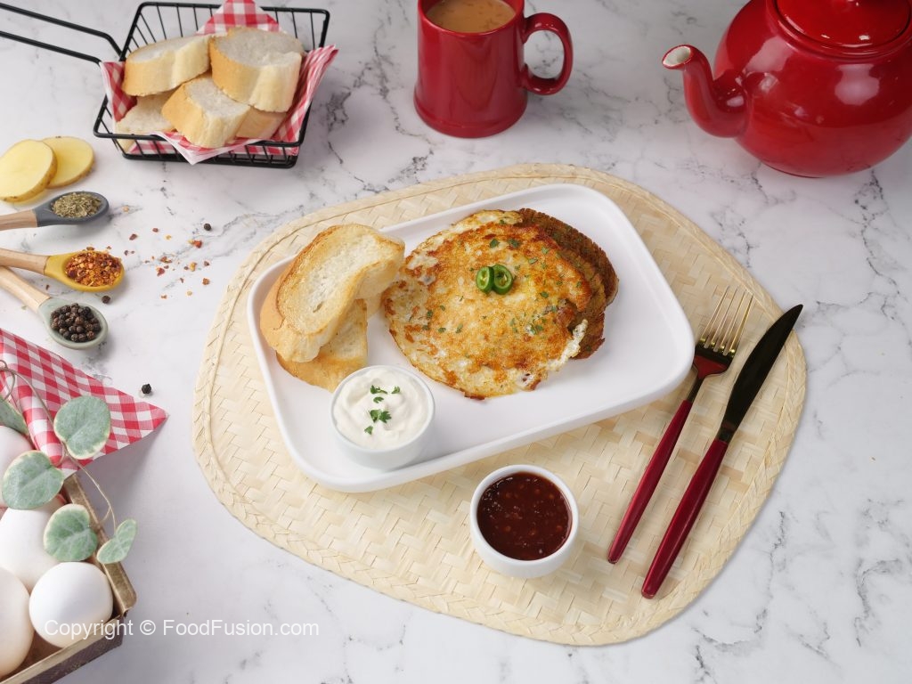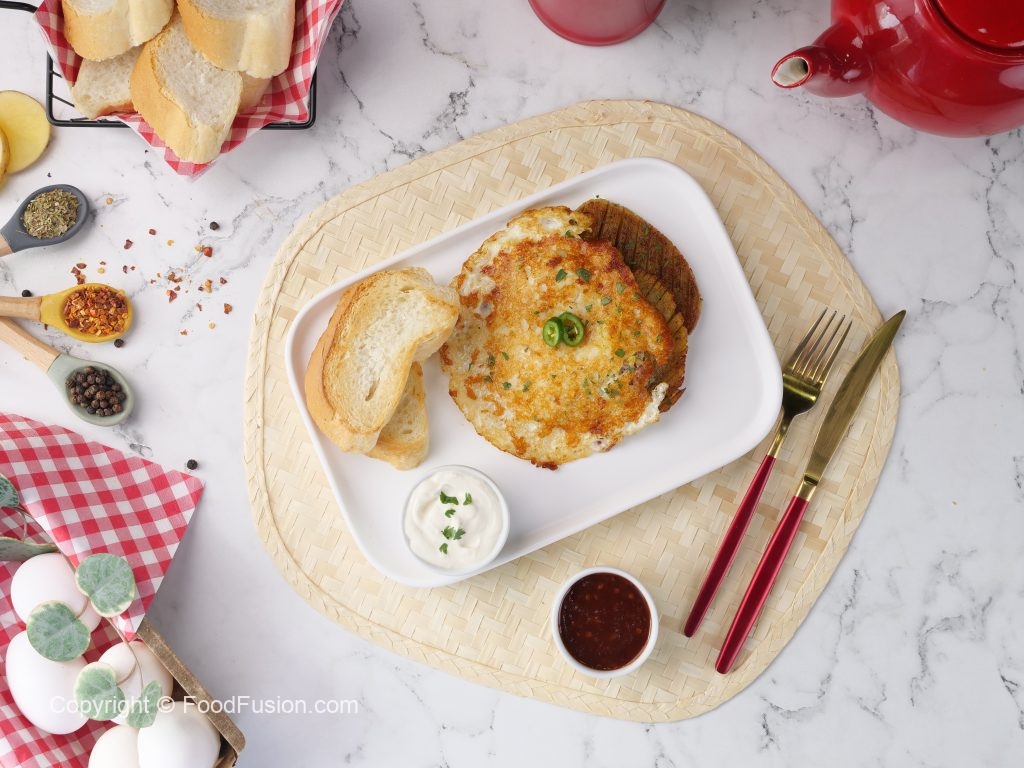 -Serving plate mein fried potatoes,fried cheese egg,hara dhania & hari mirch dal dein,French bread,sour cream & chilli garlic sauce ka saath serve karein!