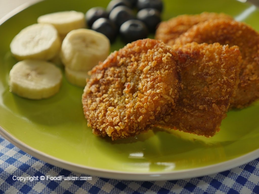 Now dip bread slices into beaten egg then coat in corn flakes.