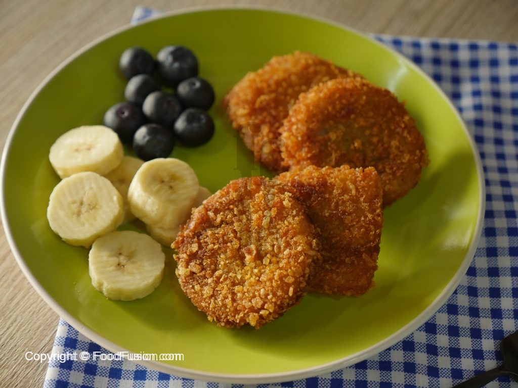 Ab bread slices ko pheetay hoye anday mein dip karein phir corn flakes mein coat ker lein.