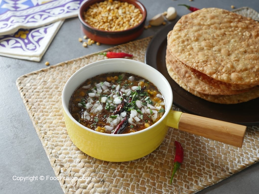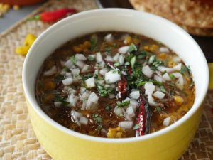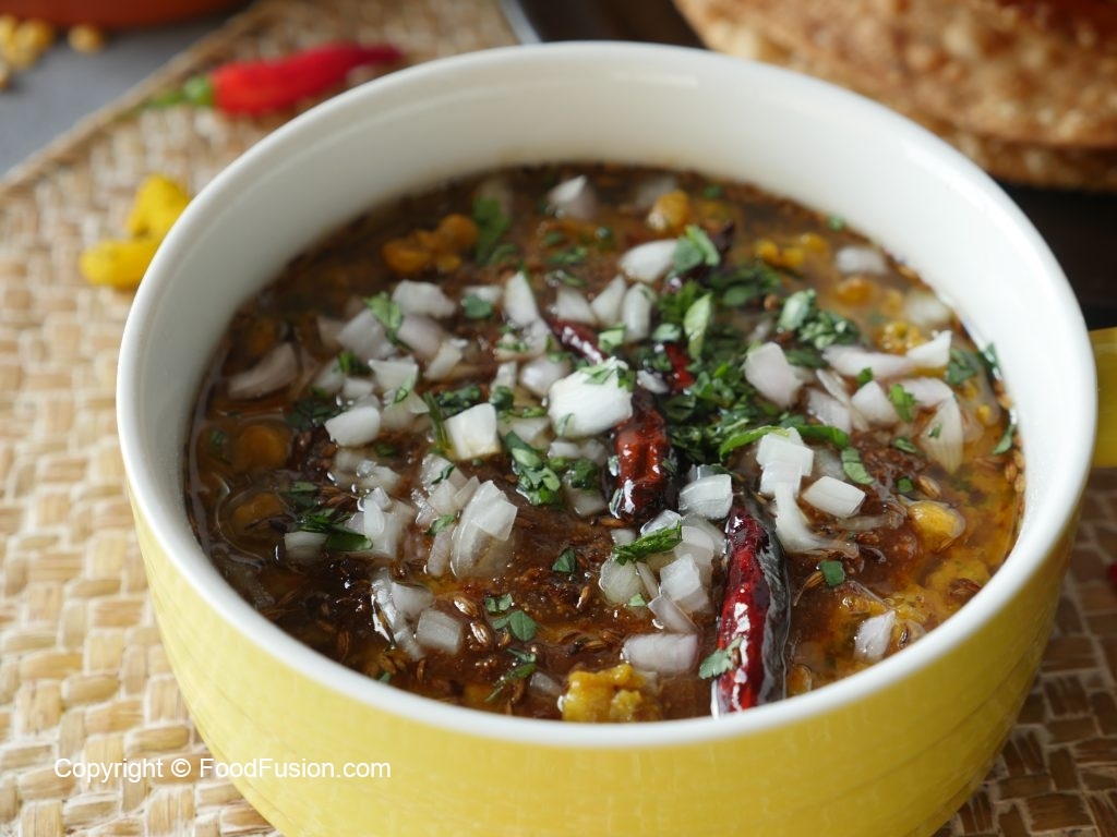 Take out cooked daal in a serving dish,add tamarind pulp,chaat masala,pour tadka,add onion,fresh coriander & serve!