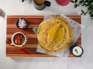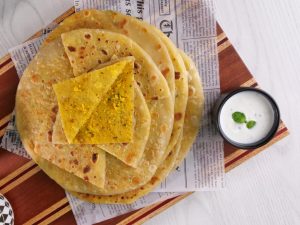-Heat griddle & fry paratha from both sides with clarified butter.