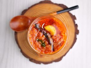 -Add garlic paste,tamarind pulp,pink salt,red chili powder,mix well & cook until it dries up & set aside.