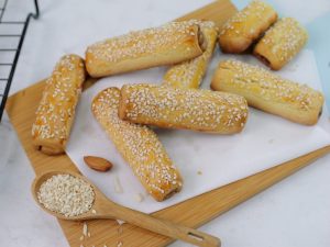 -Place rolled date filling on the dough,roll the dough slightly & seal the edges then cut the dough into 3” finger cookie.