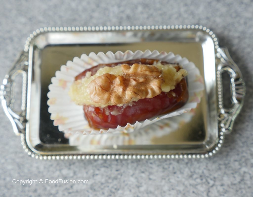 Khajure mein tayyar filling bhar dein aur walnuts sa garnish ker ka serve karein.