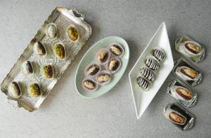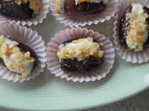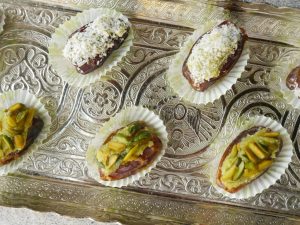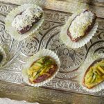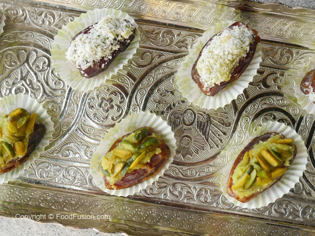 Stuffed dates with prepared filling,garnish with pistachios or desiccated coconut & serve!
