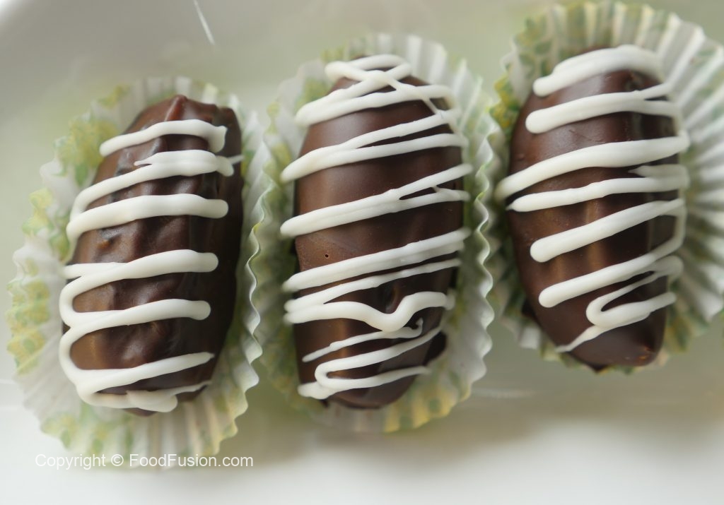 Pipe in bag ki madad sa khajure ko cream cheese+shahad mixture sa bhar dein aur crushed walnuts mein coat ker lein.
