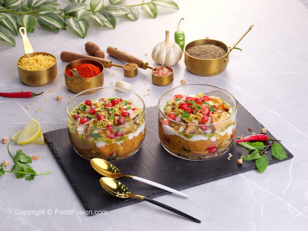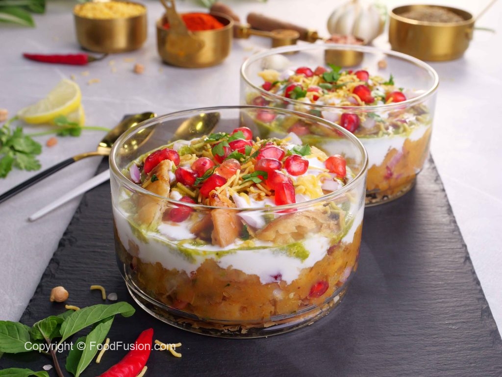 -In a serving bowl or cup, add crushed papri, prepared potato mixture, whisked yogurt, prepared green chutney, sweet tamarind chutney, crushed papri, onion.