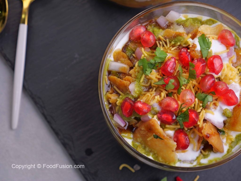 -Garnish with whisked yoghurt, pomegranate, daal sev, & serve!