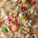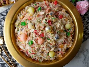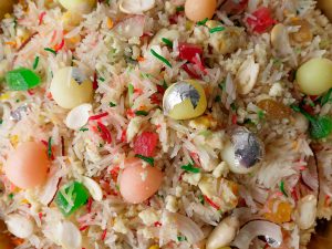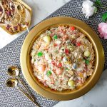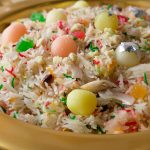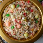 Now add stained red,green & orange colored rice then add washed & strained dry nuts.