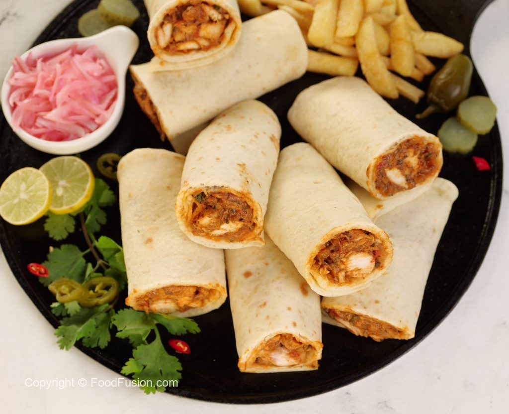 -Shawarma bread per mayonnaise dal ker pheela lein aur cooked chicken dal ker roll ker lein.