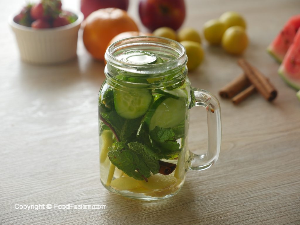 In jug,add mint leaves,ginger,cinnamon sticks,lemon slices,apple,cold water,stir & cover.