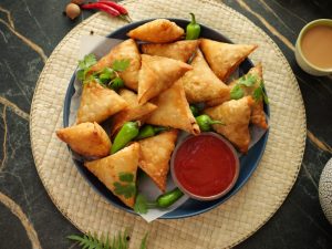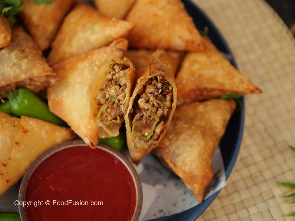 -Take samosa sheet & make pocket,add chicken stuffing in the center,stuffed green chilli,roll into the shape of samosa & seal corners with flour slurry (makes 16-18).