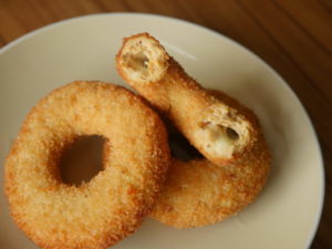 Mozzarella cheese slices ko doughnut ki shape mein rakh dein,halka sa press karein,haathon ko oil sa grease karein aur cheese ko completely mince mixture sa cover ker lein.