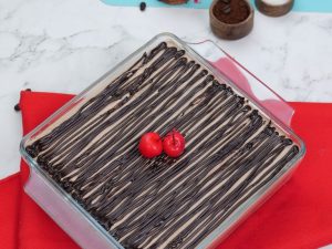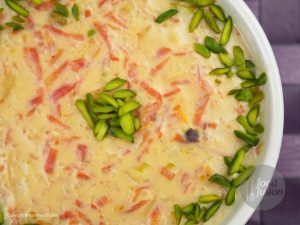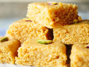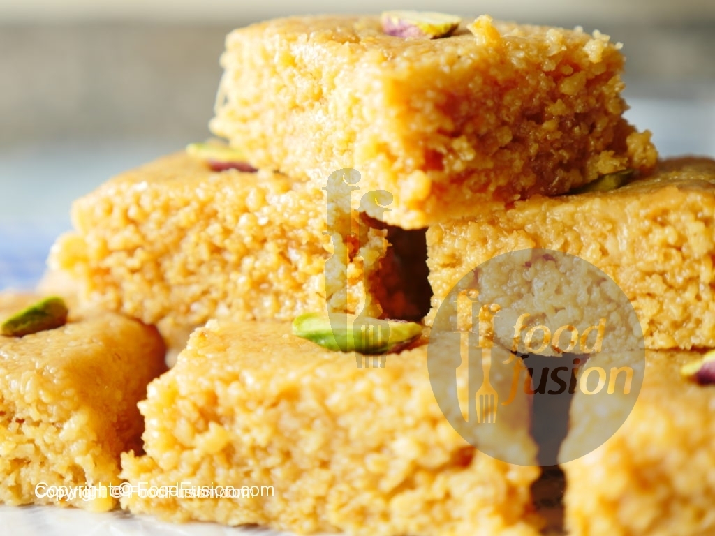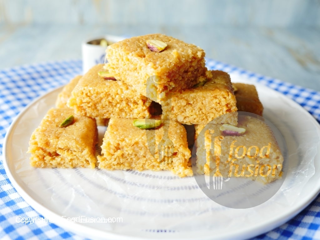 Baking dish/loaf pan ko ghee sa grease karein aur mixture ko greased mould mein dal ker press ker lein.