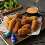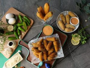 -Stuffed green chillies with prepared filling,coat in all-purpose flour then dip in whisked eggs and coat well with breadcrumbs and again dip in whisked eggs & coat with breadcrumbs & let them rest for 10 minutes (makes 45-50).