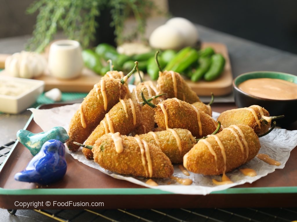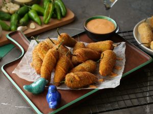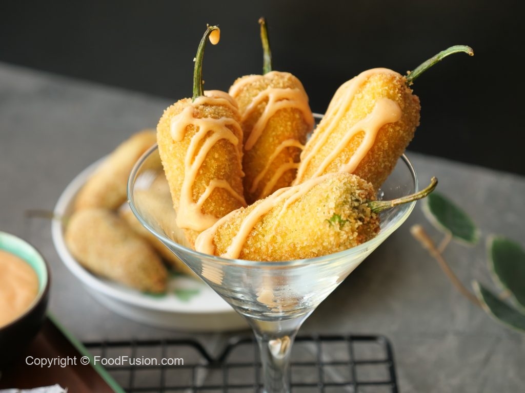 -In a wok,heat cooking oil (170-180C) & fry stuffed chillies on medium high flame until golden & crispy.