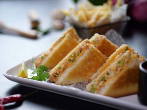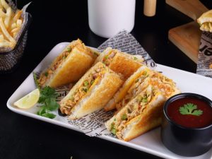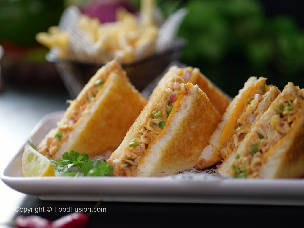 -Bread slice par chicken filling spread karein,cheese slice rakh kar dusri bread slice se cover karein, upar se melted butter brush karein.