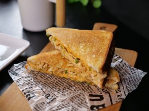 -Heat cast iron frying pan,place sandwich (upside down),apply melted butter on another side & grill from both sides until golden & crispy (makes 6).