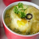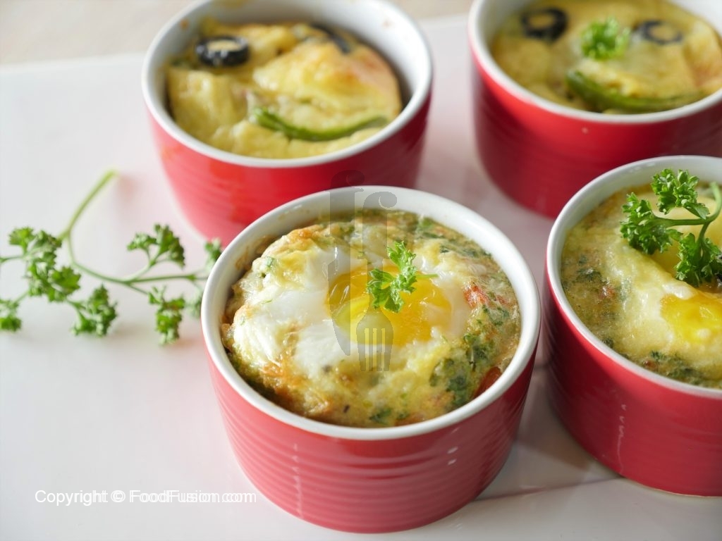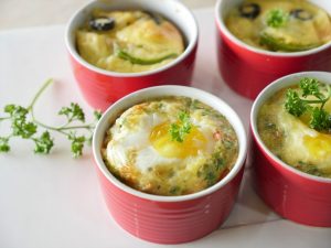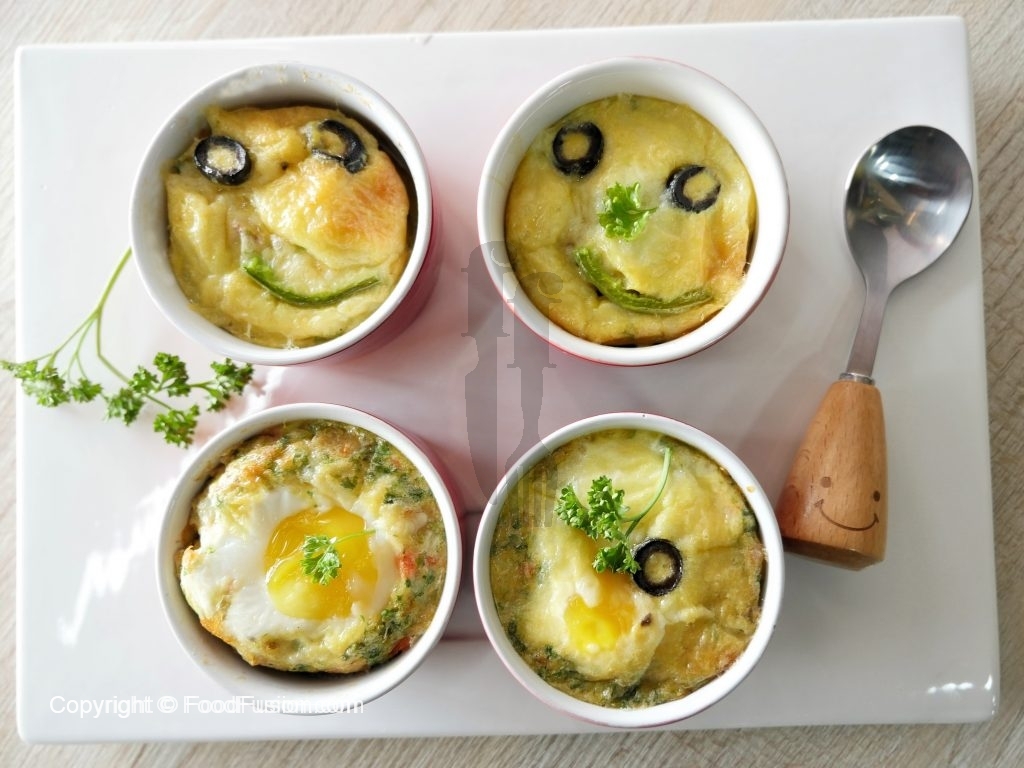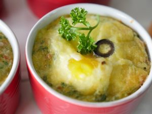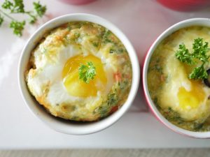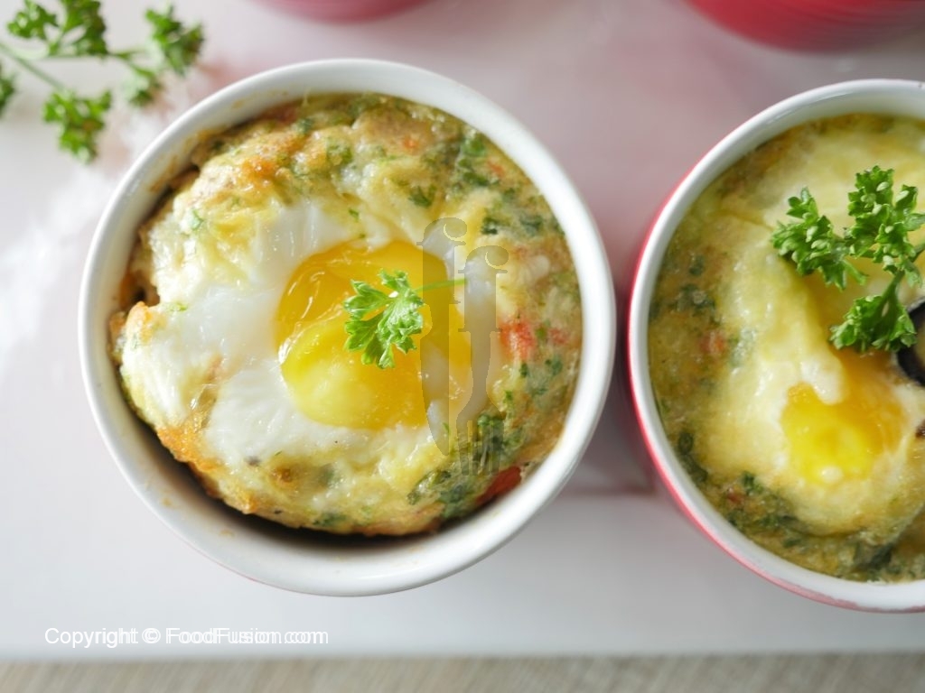 In ramekins or oven safe bowls,add prepared egg mixture.