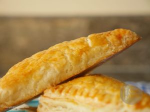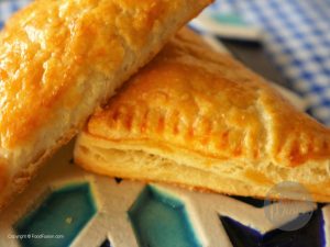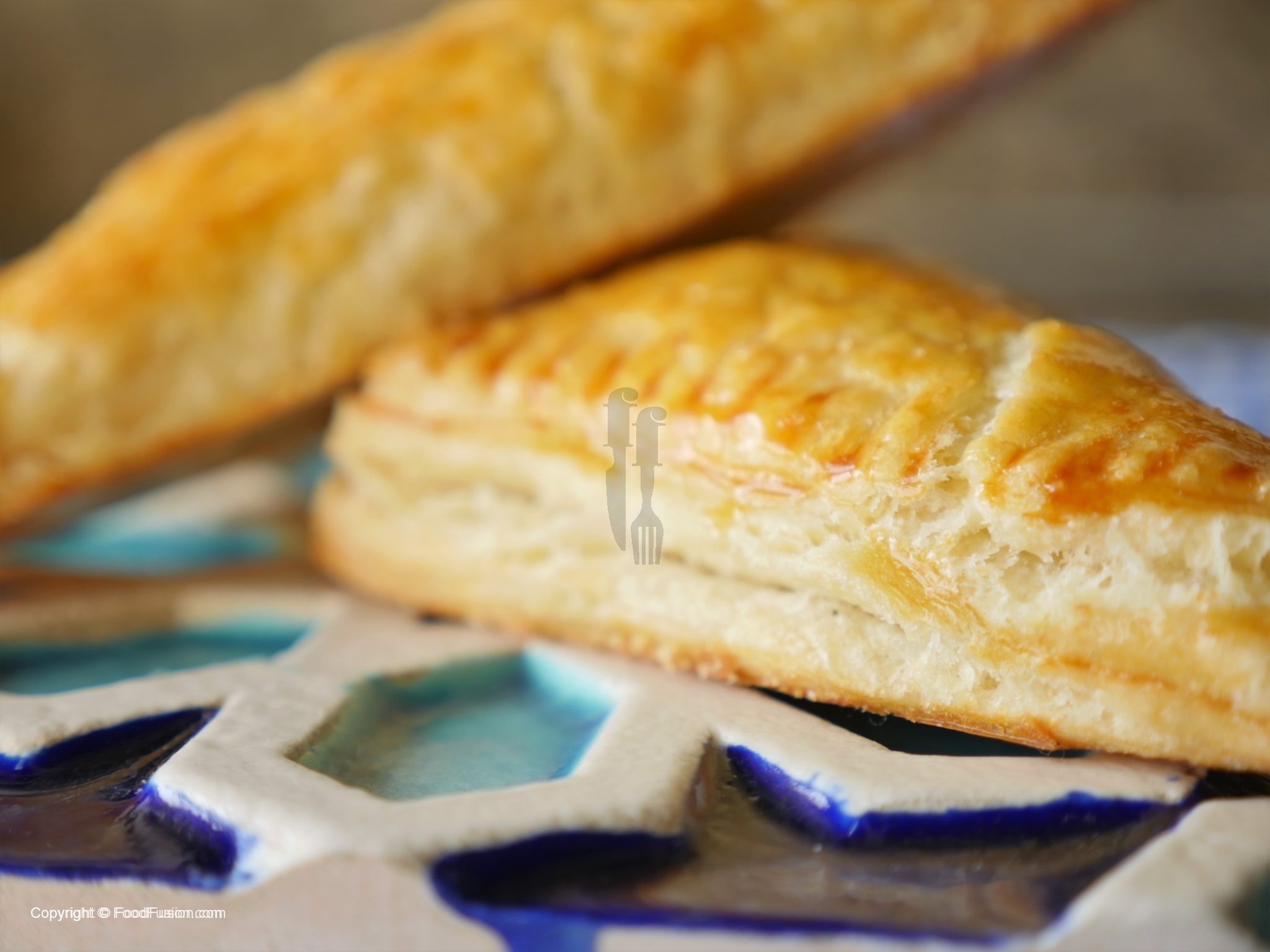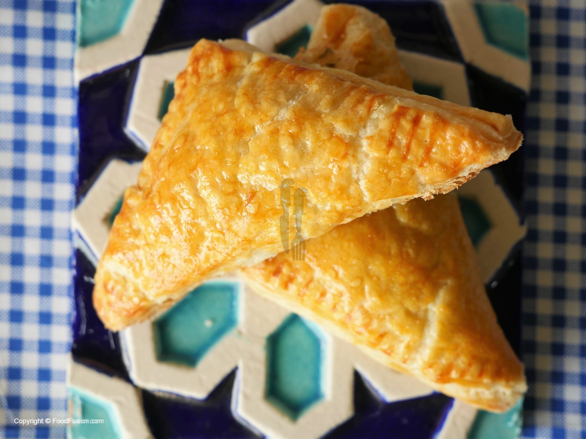 Roll out puff pastry,cut in desired shape with cutter,egg wash,add egg and cheese filling,fold and gently press with fork to seal and egg wash again.