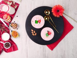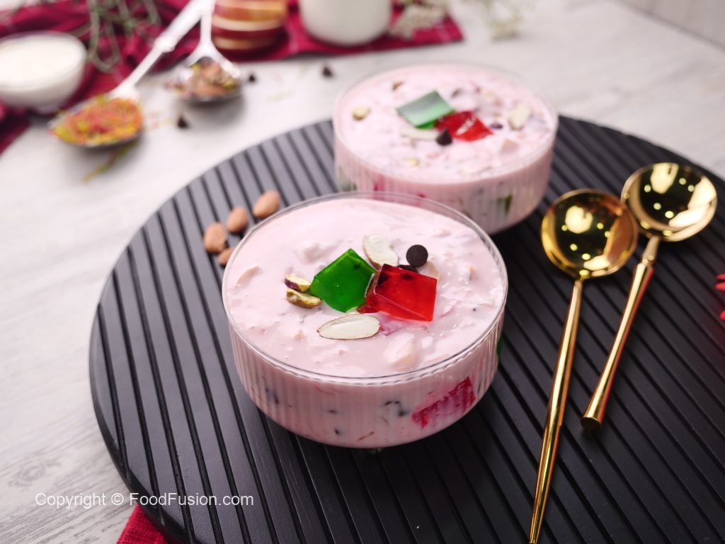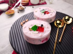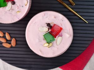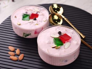 -Garnish with green & red jelly cubes,almond,chocolate chips,pistachio & serve chilled!