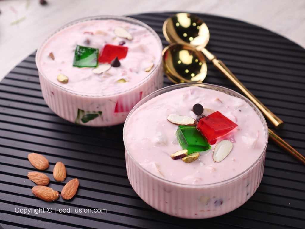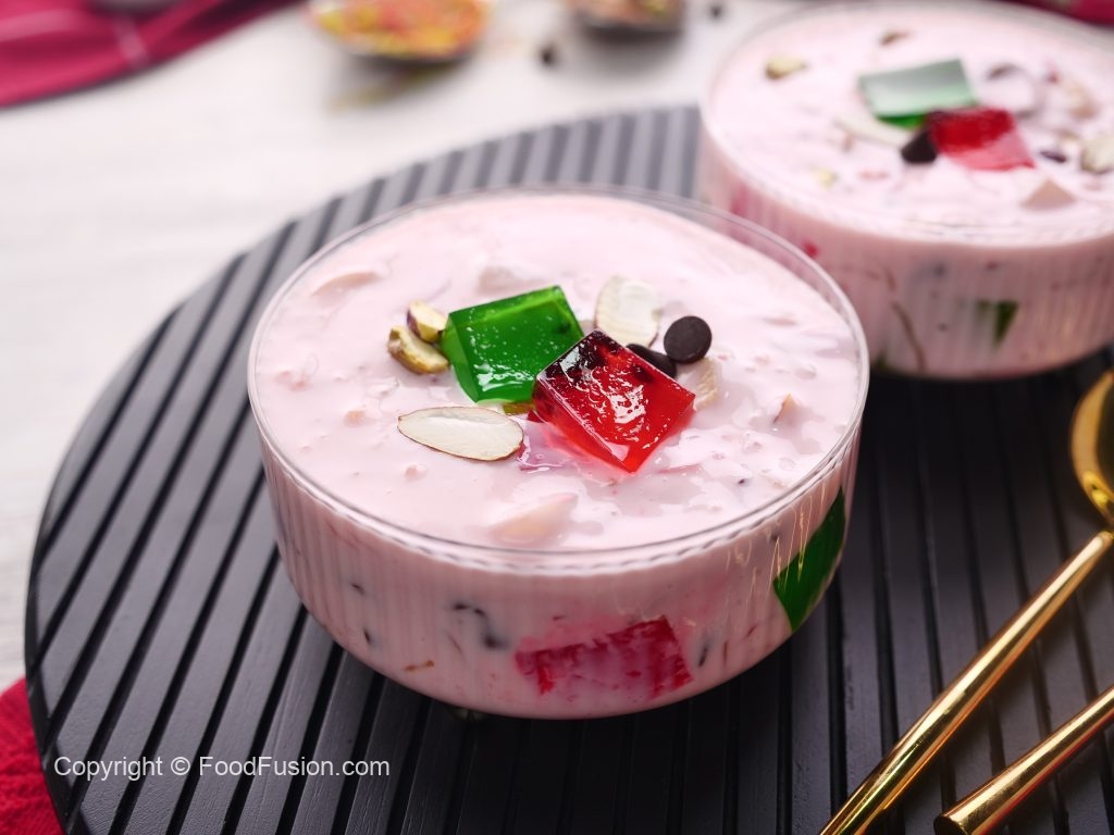-Green & red jelly cubes,badam,chocolate chips,pista dal dein & thanda serve karein!