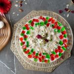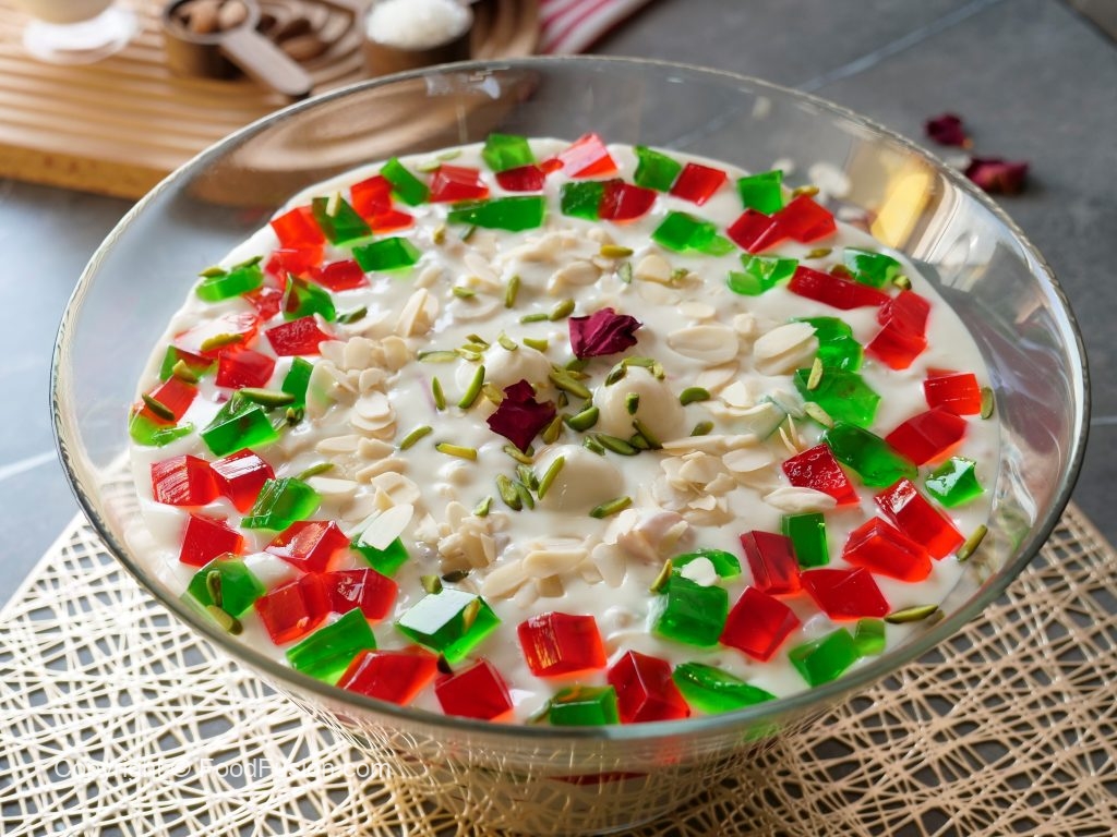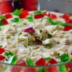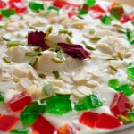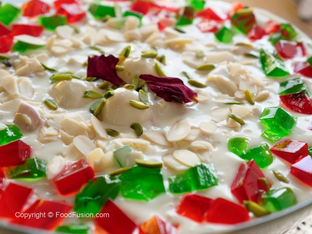 In a serving dish,add lab e shiren,red & green jelly and garnish with red & green jelly,almonds, pistachios & serve!