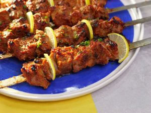-Thread marinated beef on metal skewer (makes 6).