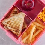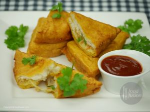 -Half moon tortilla mein tayyar sauce,salad patta,tayyar fajita filling aur cheddar cheese slice dal dein aur fold ker ka triangle shape bana lein (make 4).