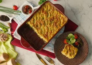 10 x 4 inch ki baking dish may pehle tayar sauce, phir fried fish, mozzarella cheese, cheddar cheese or tayar creamy potato daalen. Spoon ki madad se level karen or design banayen.