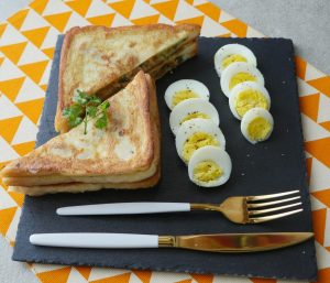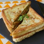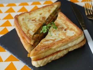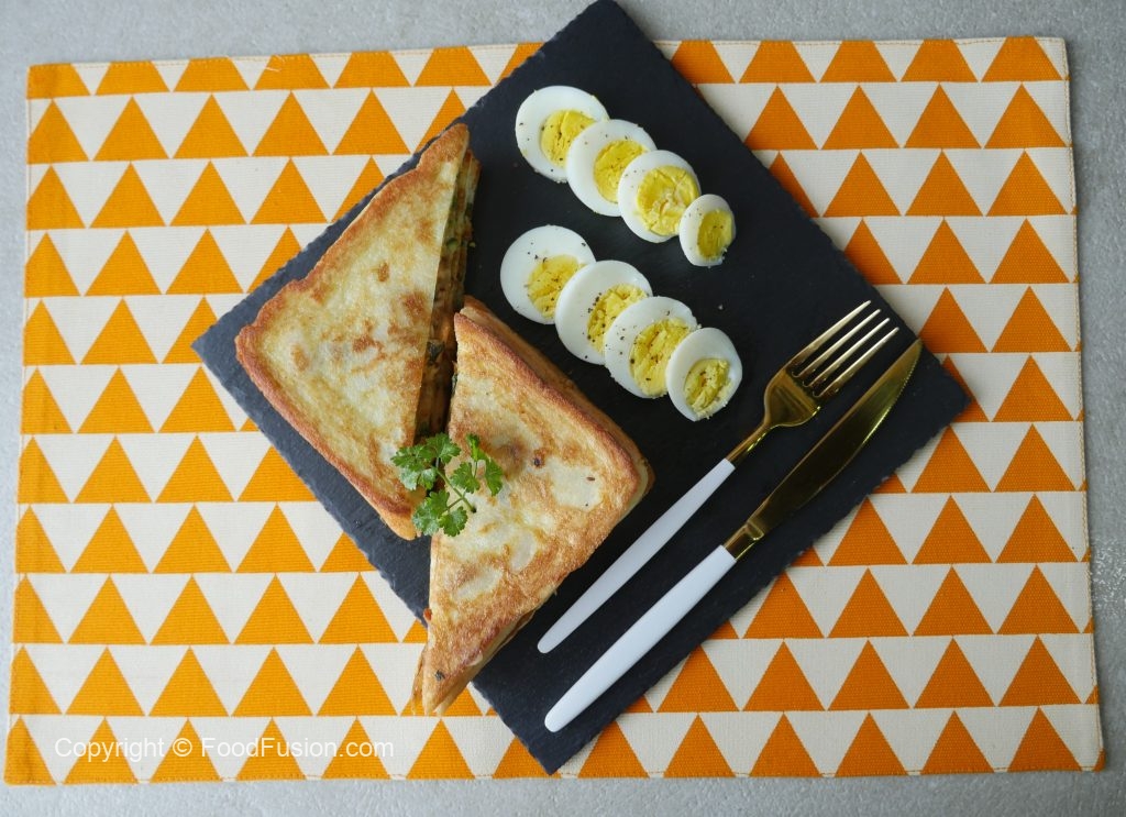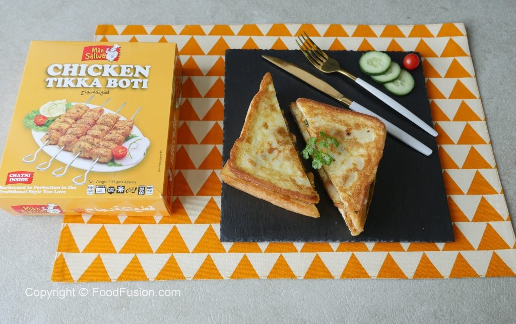 On bread slice,add & spread prepared chicken filling,top with another bread slice and press evenly with the help of the plate.