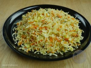 Cook for 2 mins and then add the rice and fried egg and mix. Add ¼ cup water and keep it on low flame for 5 mins.