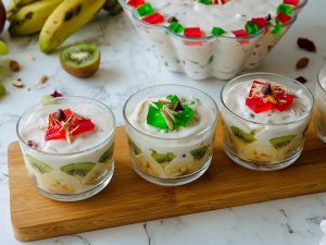 Decorate serving glass with banana and kiwi slices,add fruit cream and garnish with red jelly,almonds.