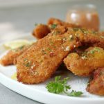 -Now coat marinated strips with all-purpose flour than dip in whisked eggs & coat with breadcrumbs.