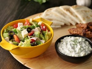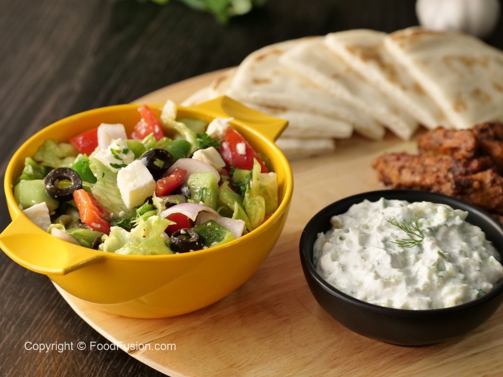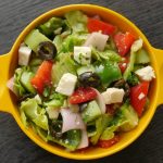 Bowl mein shimla mirch,kheera,tamatar,pyaz,ice berg,brown sugar,namak,kali mirch crushed,black olives,lemon juice,feta cheese aur olive oil dal ker mix ker lein.