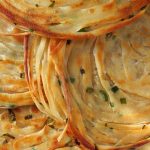 -Spread clarified butter,sprinkle dry flour & cut into thin strips,sprinkle green onion leaves & roll out 4 strips like a swiss roll (stretch in between).