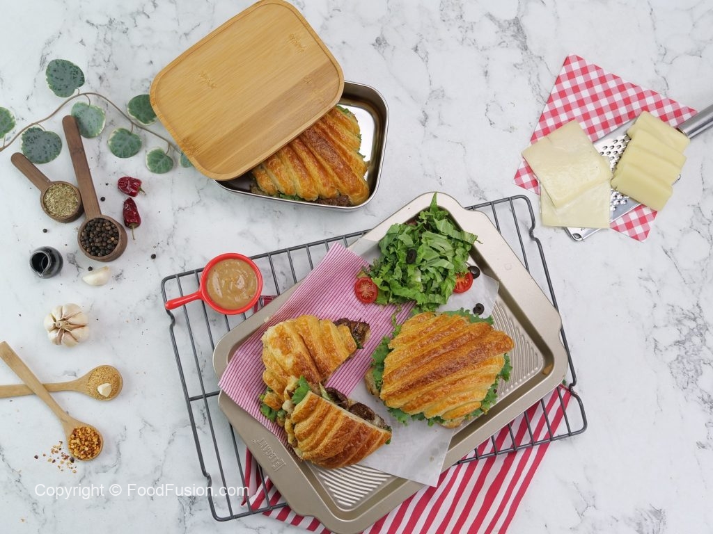 -Grease grill pan with butter & grill croissant,add cheddar cheese slice,mozzarella cheese,cooked beef,prepared spicy bbq burger sauce,caramelized onion & lettuce leaves.