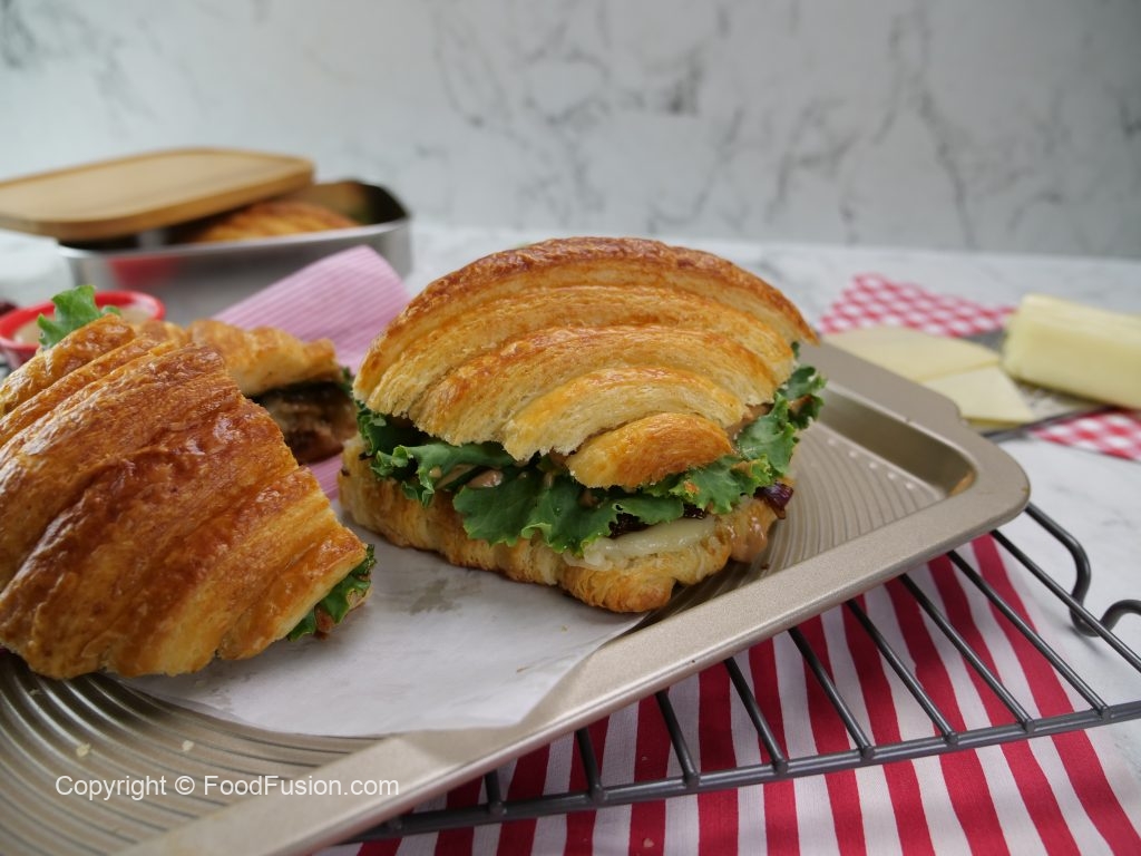 -Tayyar spicy bbq sauce ko top croissant per dal dein & flip ker ka sandwich tayyar ker lein (makes 3-4).