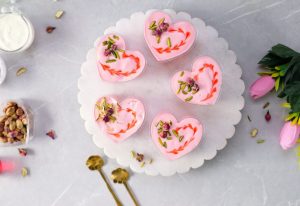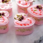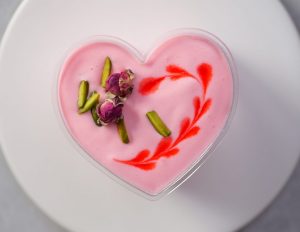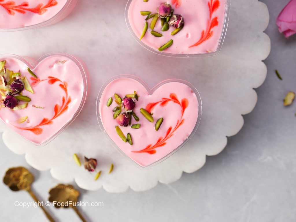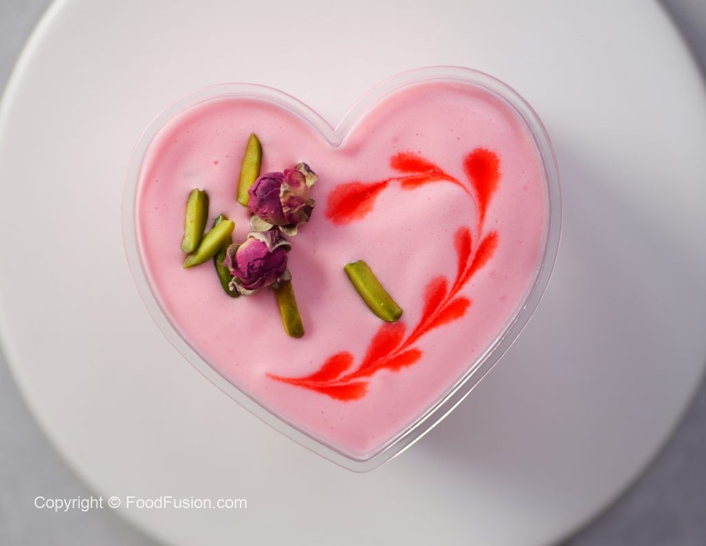-In a serving cup,add prepared rose cream,pistachios,almonds,syrup coated pheni & spread evenly then add prepared rose cream & garnish with rose syrup,pistachios & dried rose buds (makes 8-9).