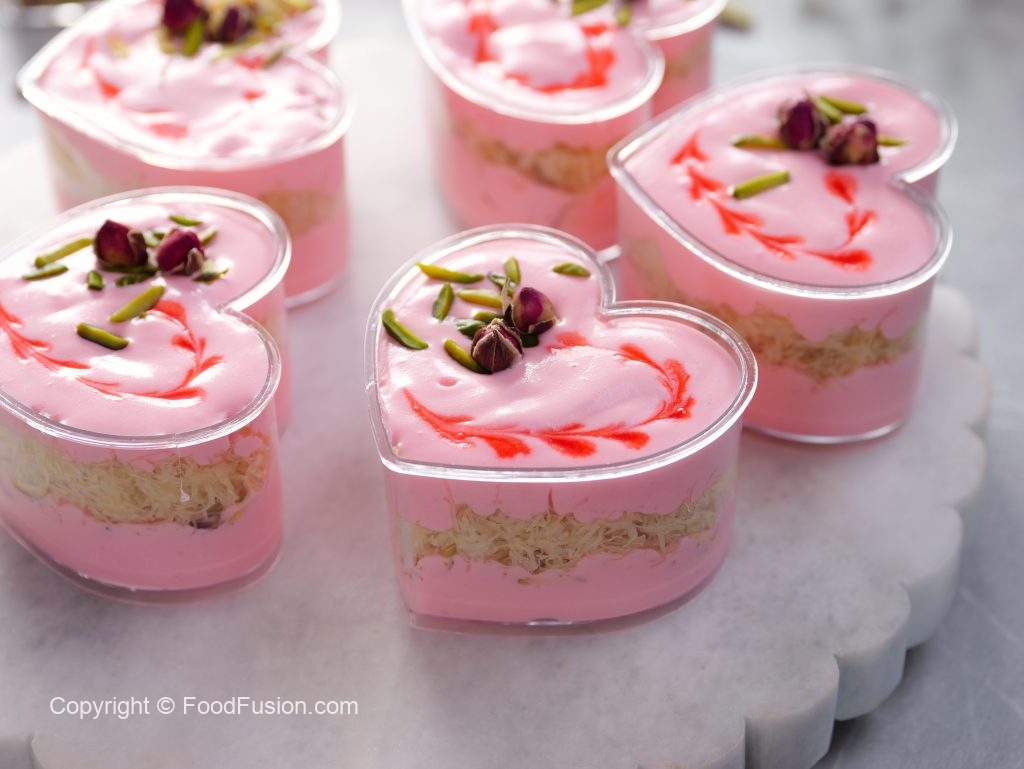 -Serving cup mein tayyar rose cream,pista,badam aur syrup coated pheni dal ker evenly pheela lein phir tayyar rose cream dal dein,rose syrup,pista aur dried rose buds sa garnish ker lein (makes 8-9).