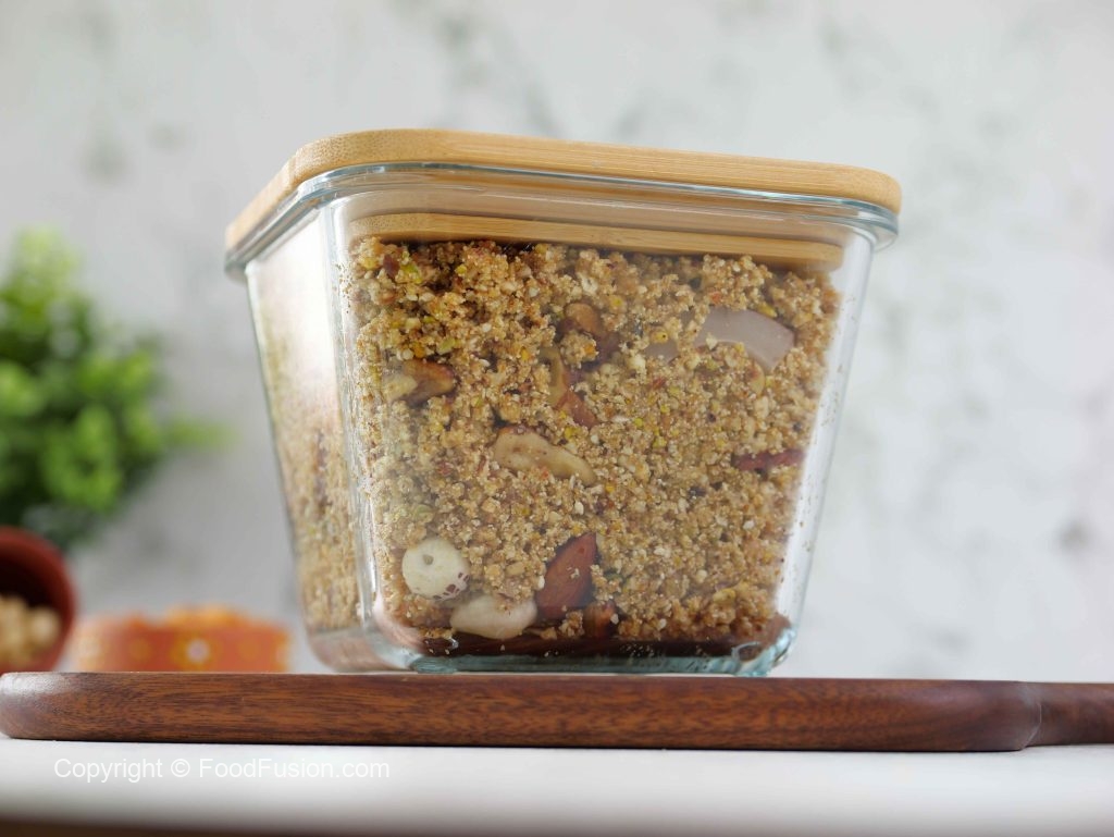 -Phir se ghee melt karein aur almonds, pistachios, cashews, walnuts aur dried coconut add karke low flame par 3-4 minutes fry karein.
